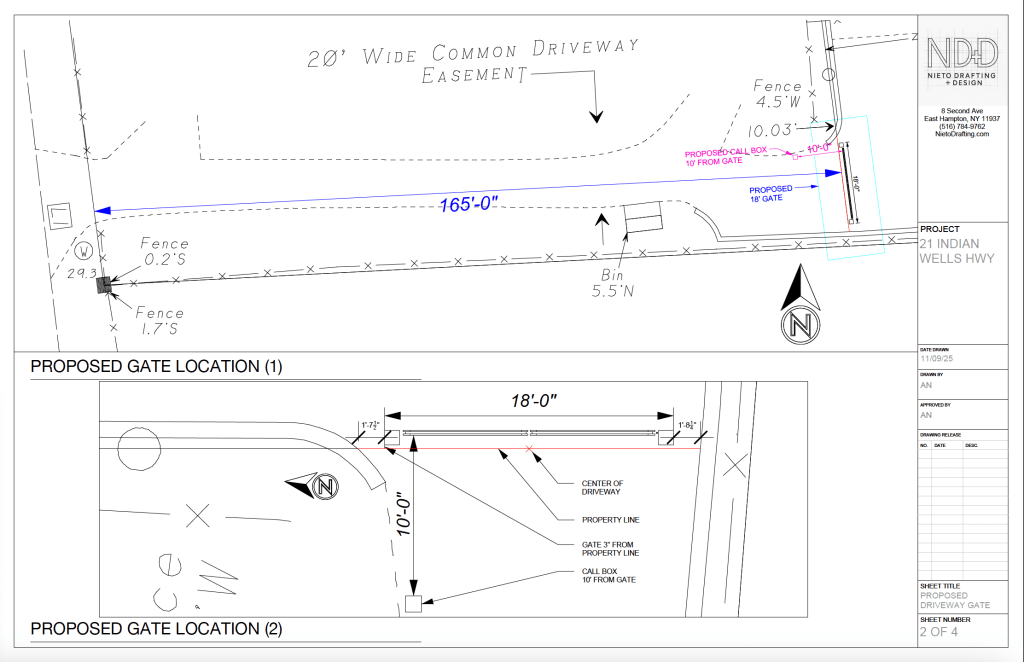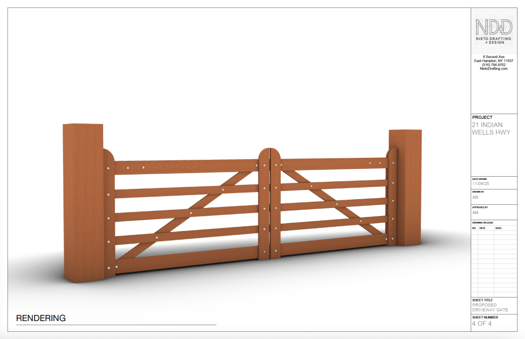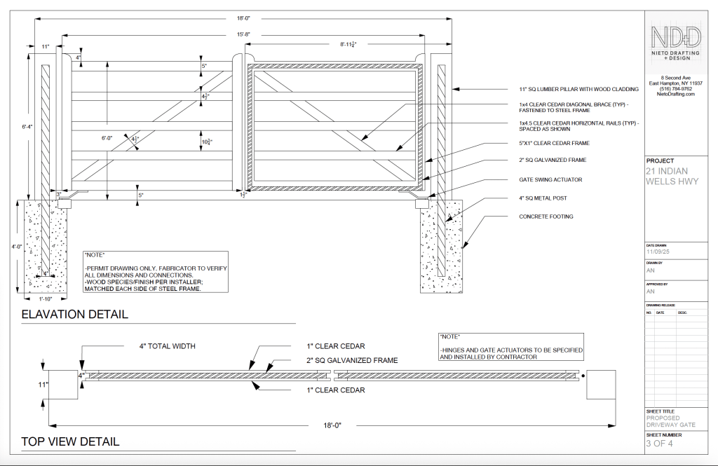 For this project, I collaborated with the homeowner and the gate contractor to develop a custom wood-and-steel driveway gate and produce all required drawings for town permitting. Working directly from the property survey, I created a full set of gate documents including detailed front elevation, plan view, actuator/hinge callouts, material labeling, and accurate site placement based on setback requirements. The final package provides a clear, code-compliant representation of the proposed gate for submission to the Town of Amagansett.