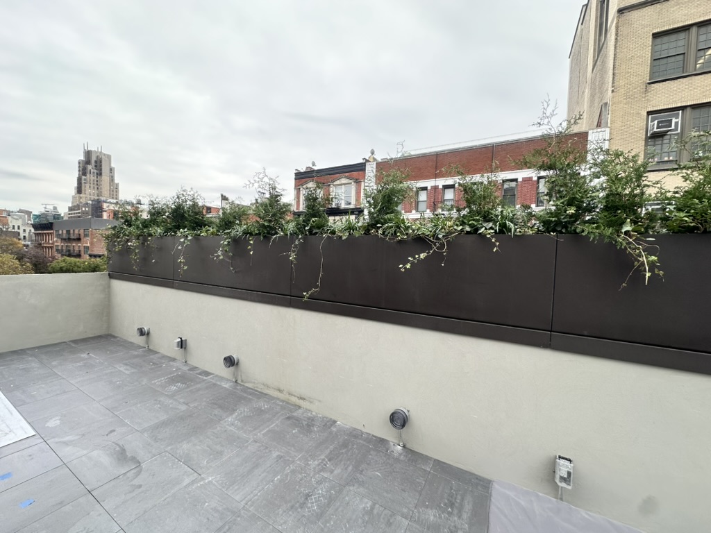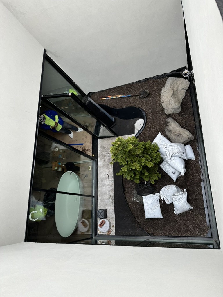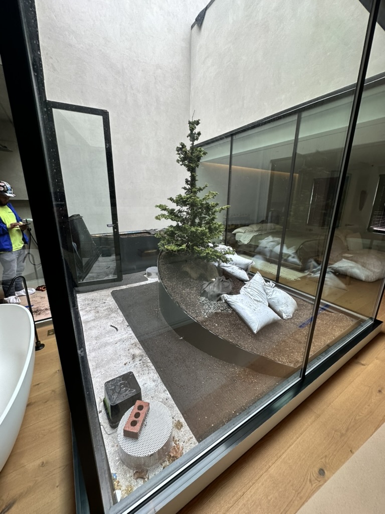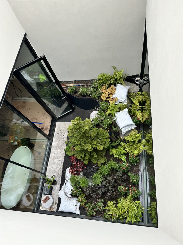 At this West 19th Street brownstone, I led the full design and coordination of a custom aluminum planter that forms the centerpiece of the master bedroom atrium. The planter was shaped to fit the space perfectly—about 3’ high at its peak and tapering down to 4” along a dramatic curve wrapping the shower area. The installation features a focal specimen tree, layered planting, custom drain extensions, and beach stone detailing.