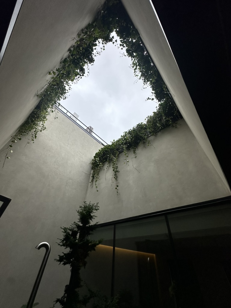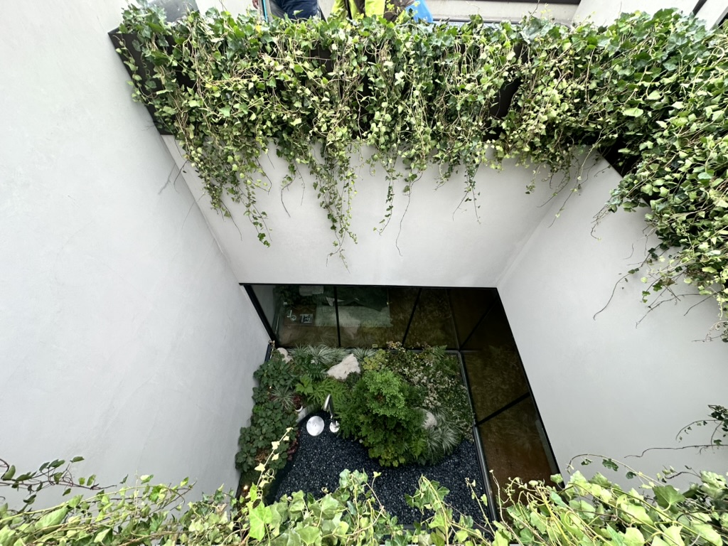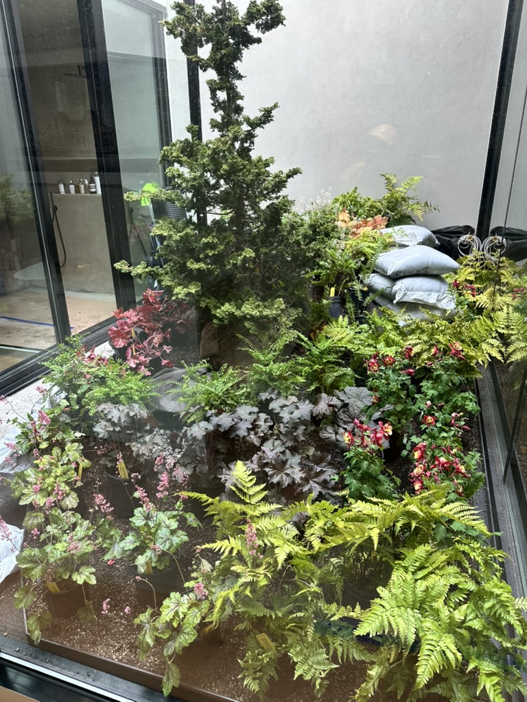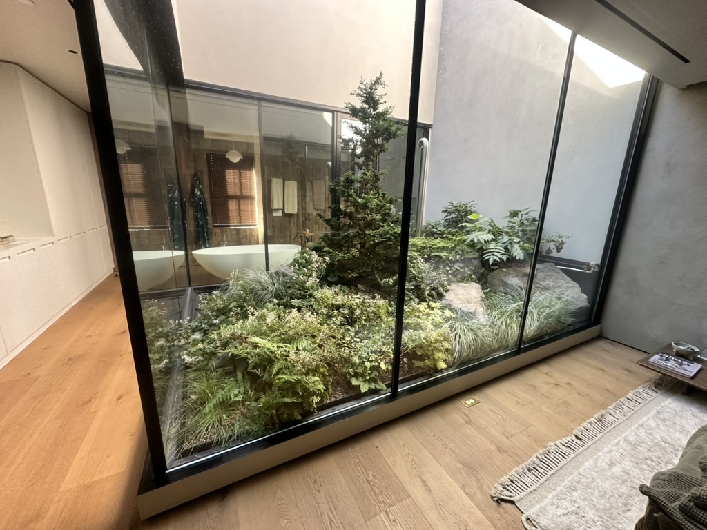 At this West 19th Street brownstone, I led the full design and coordination of a custom aluminum planter that forms the centerpiece of the master bedroom atrium. The planter was shaped to fit the space perfectly—about 3’ high at its peak and tapering down to 4” along a dramatic curve wrapping the shower area. The installation features a focal specimen tree, layered planting, custom drain extensions, and beach stone detailing.