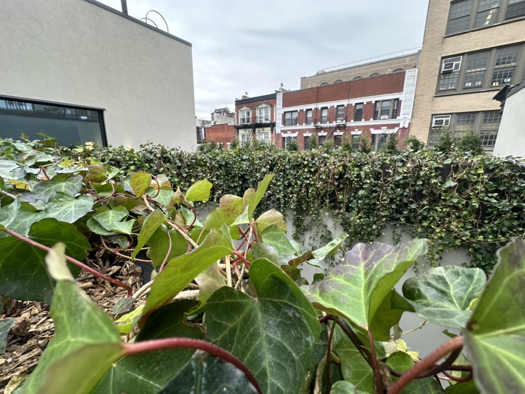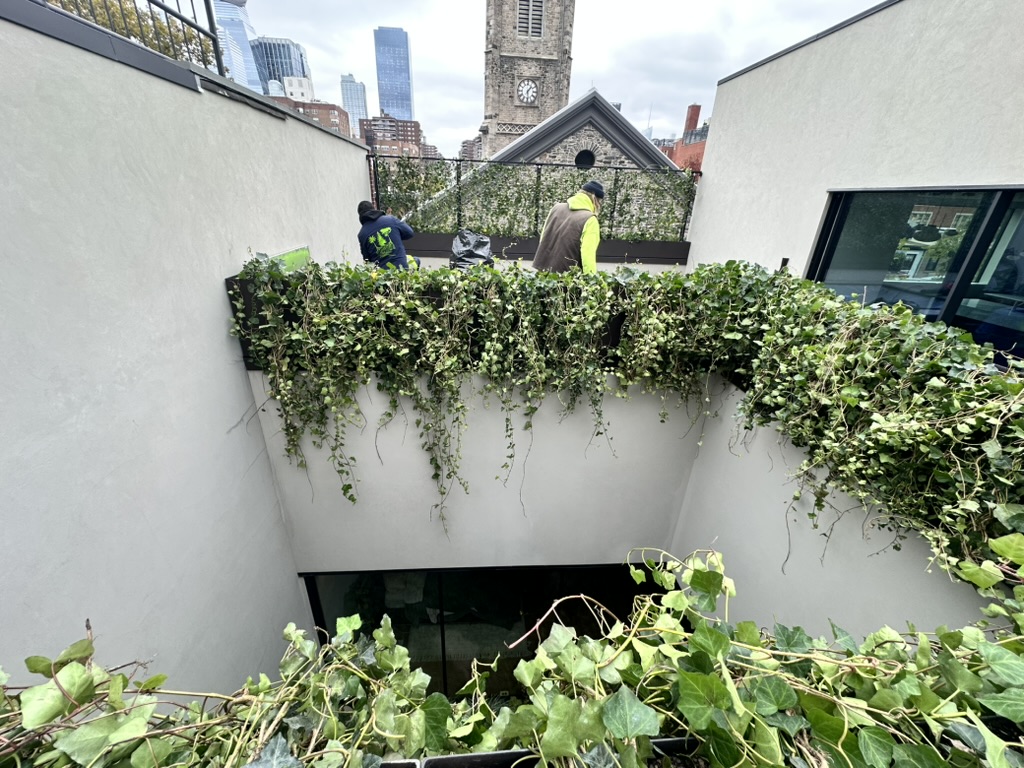 Additionally, I designed a series of roof parapet planters with a custom skirt system to sit cleanly on the parapets. On the north side, I developed a wire-mesh fence system integrated into the planters to meet fall-protection needs, with ivy planted to grow through the mesh. The remaining parapet planters were fully planted and detailed to unify the rooftop space.