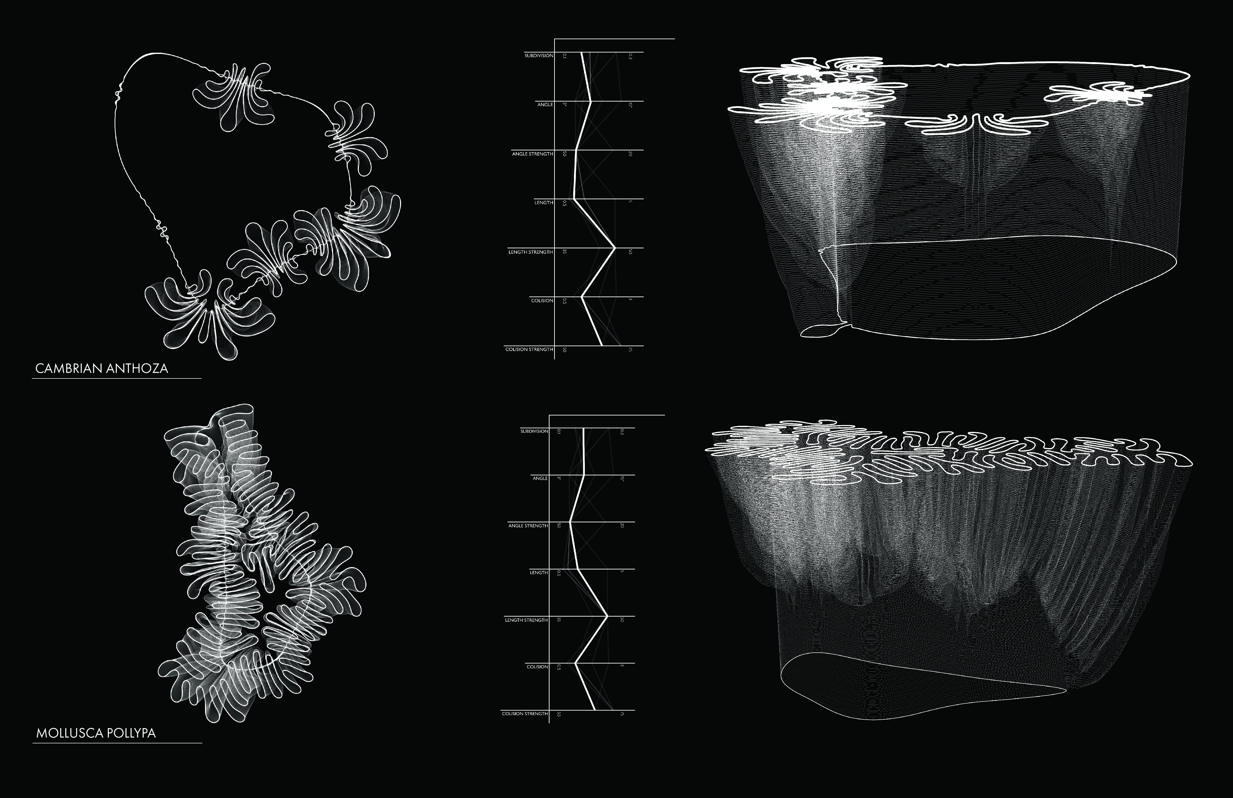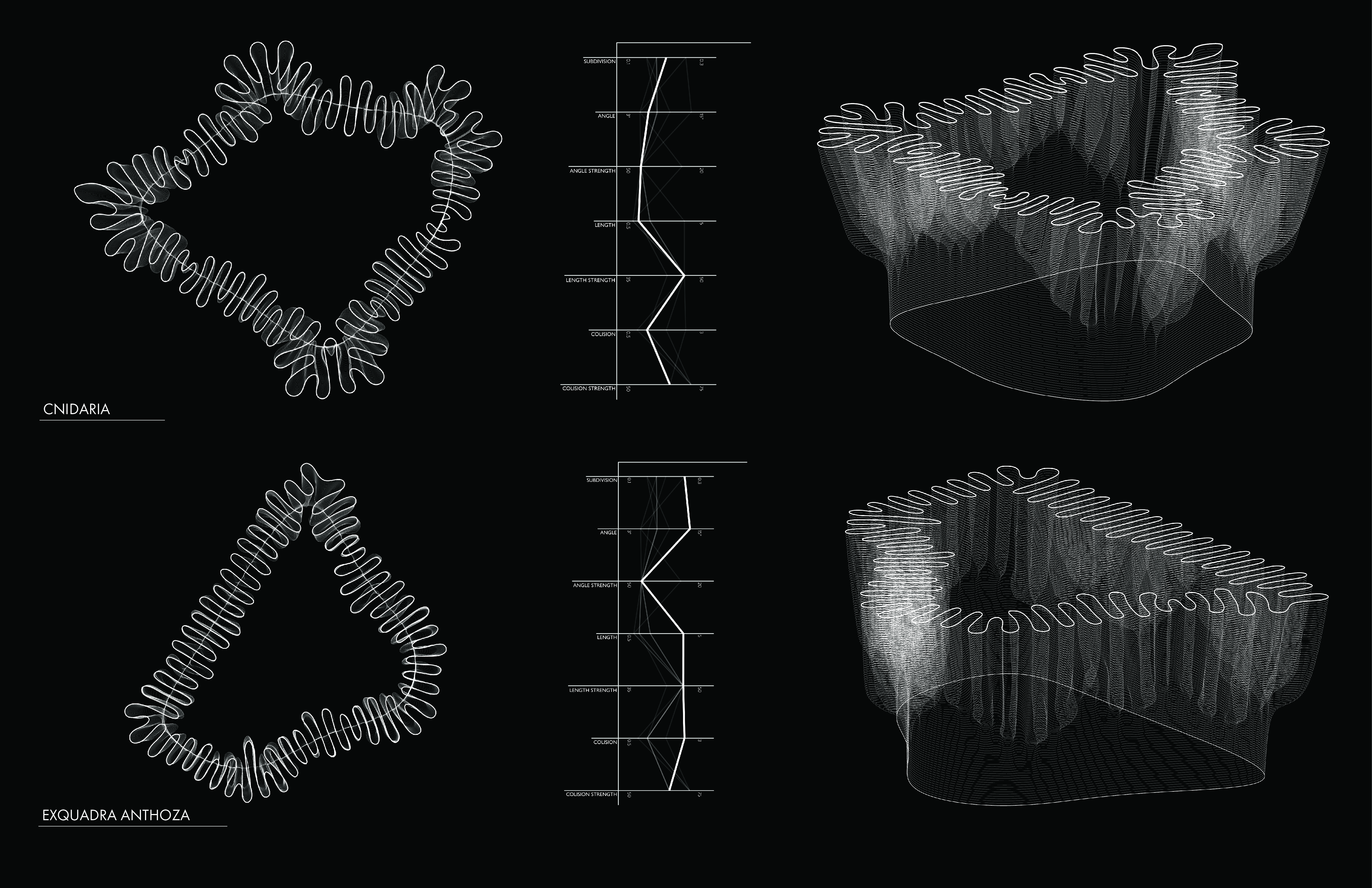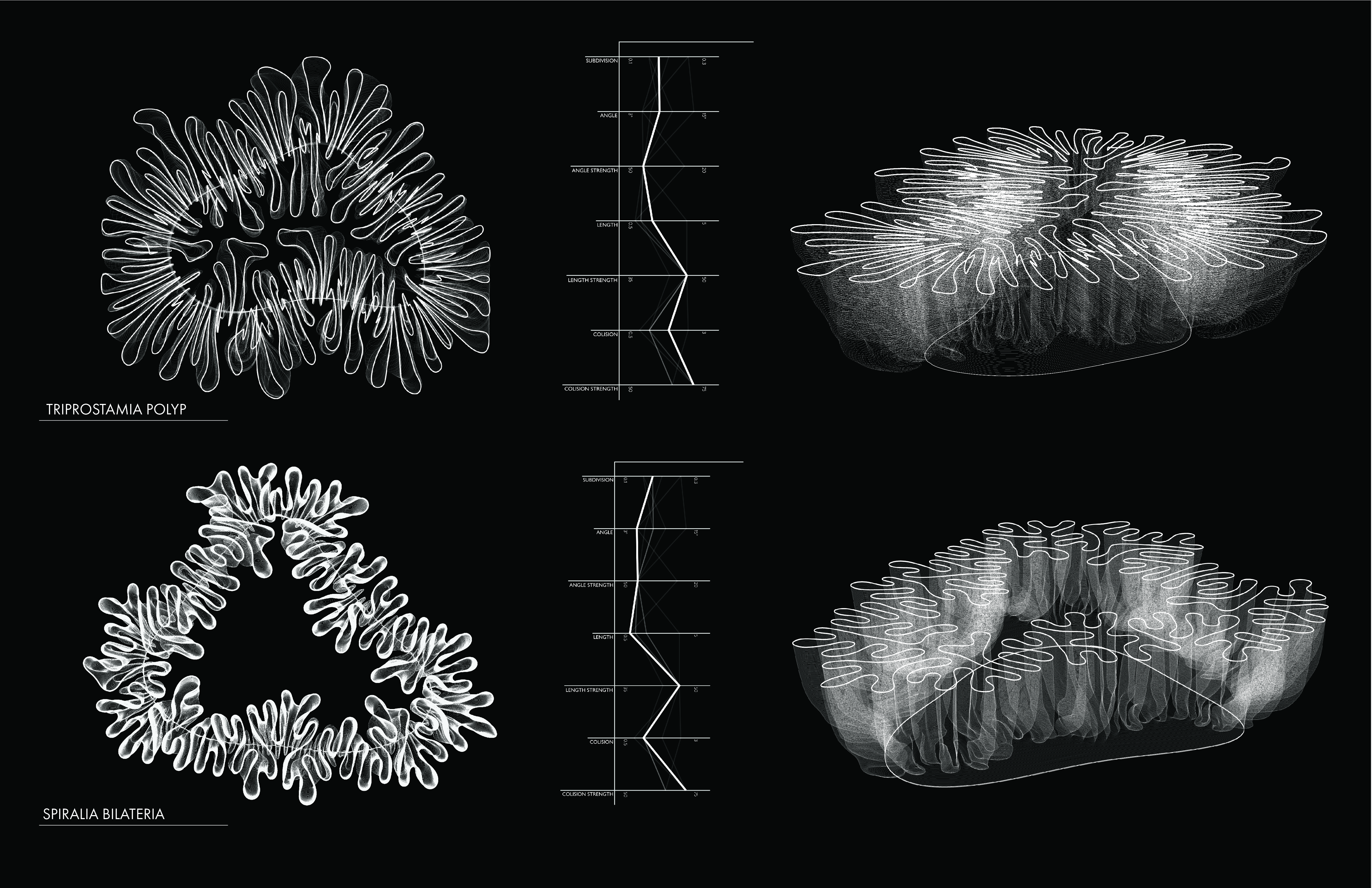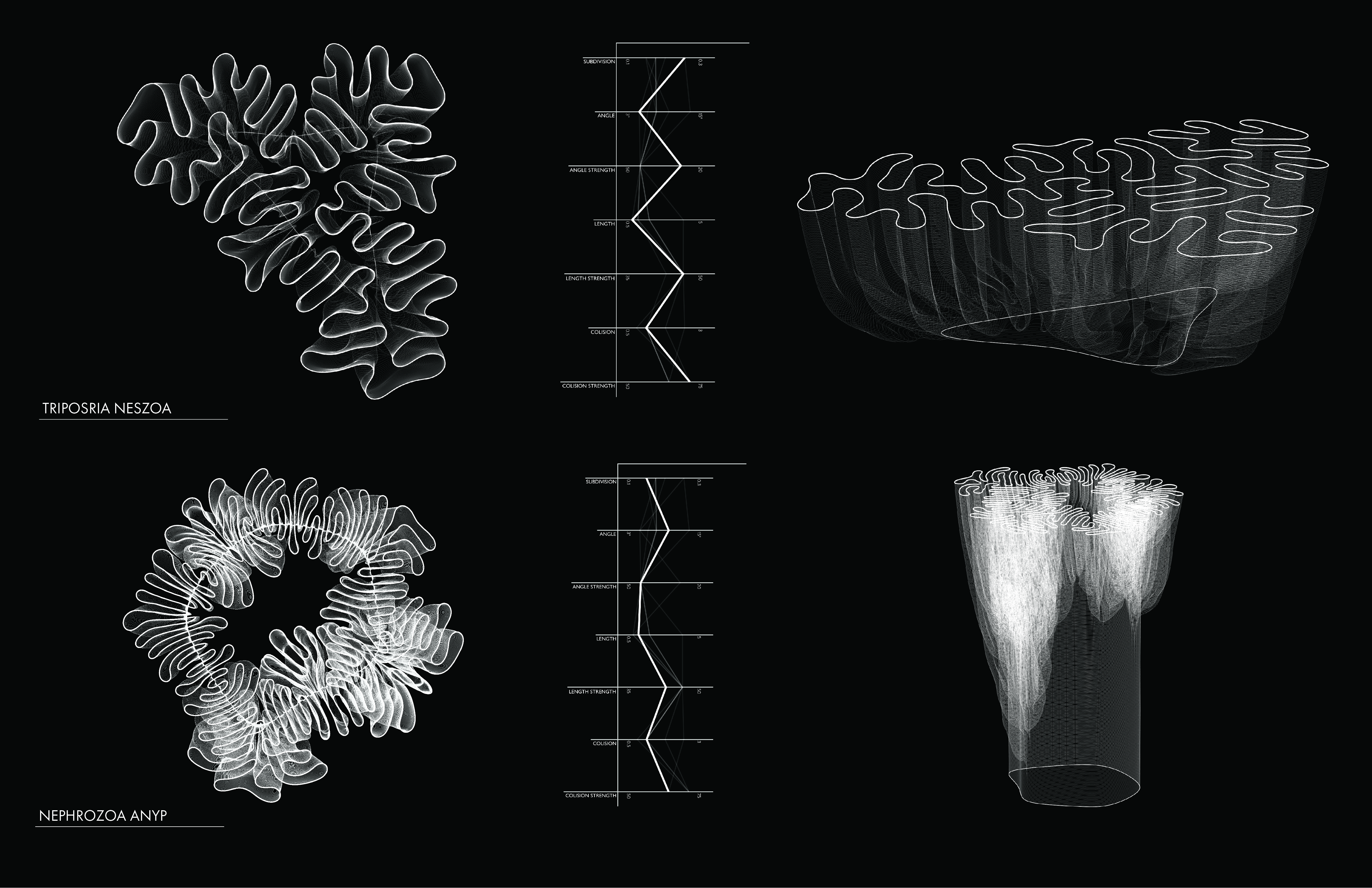 This series of nine axonometric and nine plan drawings showcase the captivating 3D forms I generated. These forms are born from the application of the differential growth algorithm, with each set of three forms originating from distinct base shapes. I documented of the specific parameters used to shape each form, offering a glimpse into my creative process.
