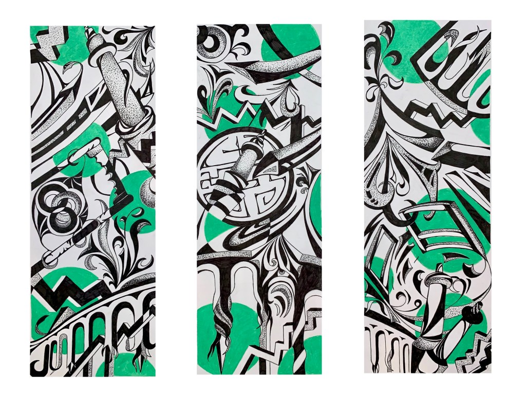Although separated into three rectangular shapes, this piece displays how designs can flow almost seamlessly into one another. The eye naturally follows the paths created by consistent shapes and patterns, despite the interruption by the blank white spacing. These three rectangles are connected by key elements of abstract Asian architectural styles. The bridges, gates, pillars and pointed roof tops keep your eye moving from one rectangle to the next, connecting the piece as a whole.
